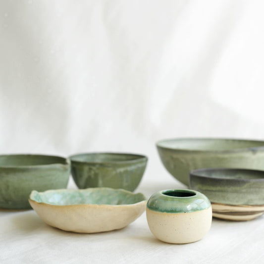 The Naked Collection explores the contrast between the rough textures of stoneware clay and glossy, vivid, strategically placed glaze.